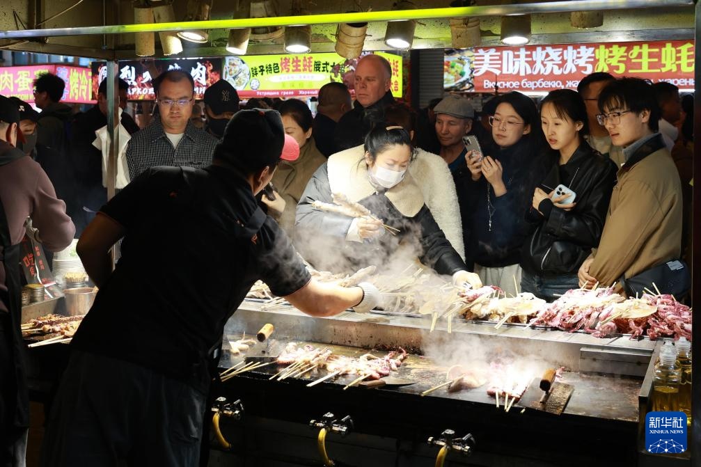 近日,黑龙江省黑河市的国际大夜市焕新迎客。黑河市位于中俄边境地区,与俄罗斯阿穆尔州首府布拉戈维申斯克市隔界江黑龙江相望。黑河·爱辉国际大夜市集赏、游、购、娱、食于一体,不但为市民带来一站式夜间消费新体验,也成为中俄双向免签政策下俄罗斯游客跨境“串门”的热门打卡地,为边城夜经济注入新活力。