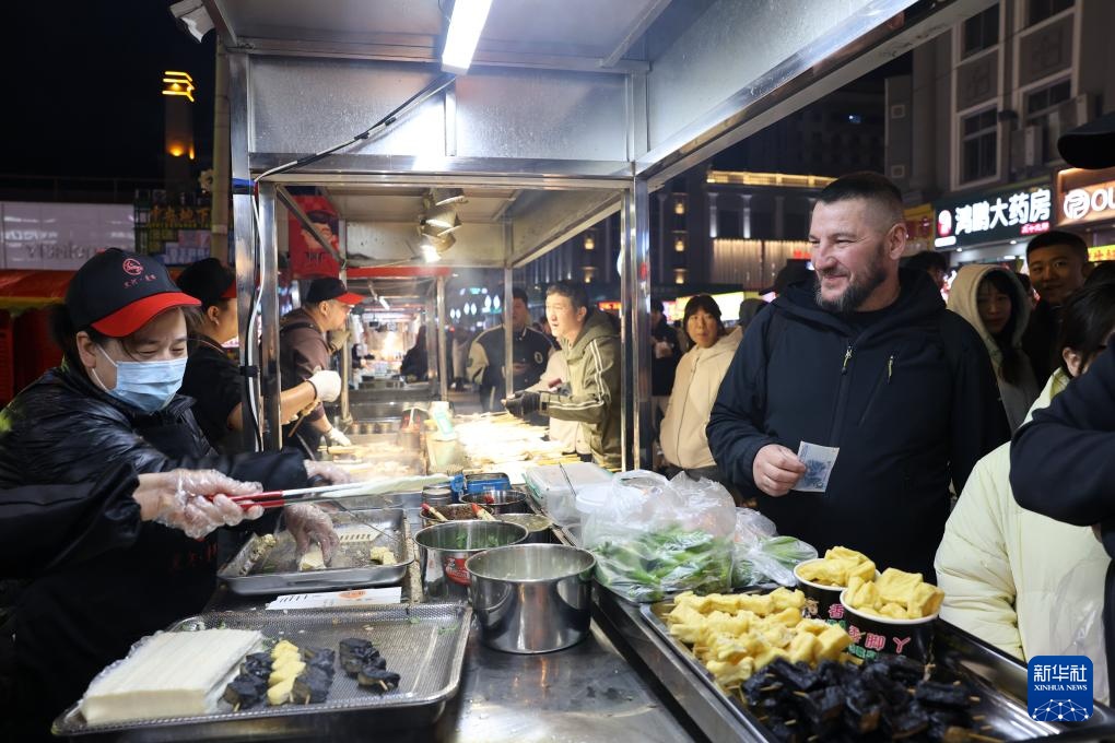 4月16日,游客在黑龙江省黑河·爱辉国际大夜市购买美食。