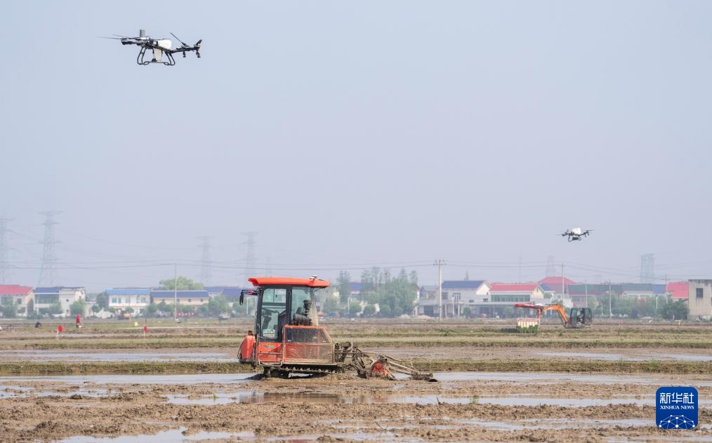 4月17日,在高塘岭街道湘江村智慧农场,无人驾驶旋耕机与农用无人机配合,进行翻耕和施肥。