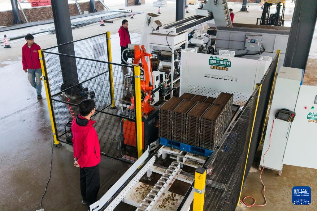 4月17日,在高塘岭街道湘江村智慧农场,工作人员观察水稻育秧流水线机械臂叠盘码垛作业(无人机照片)。