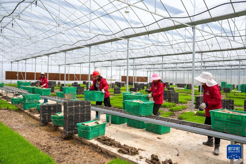 4月17日,在高塘岭街道湘江村智慧农场育秧大棚,工作人员把秧苗放在传输带上。