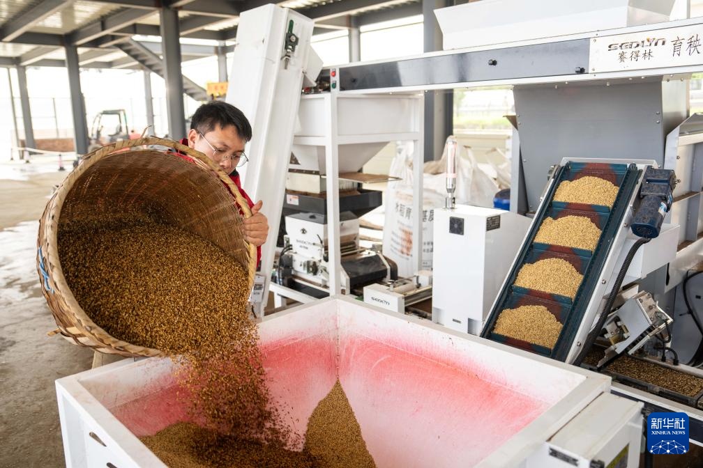 4月17日,在高塘岭街道湘江村智慧农场,工作人员在水稻育秧流水线进行稻种上料作业。