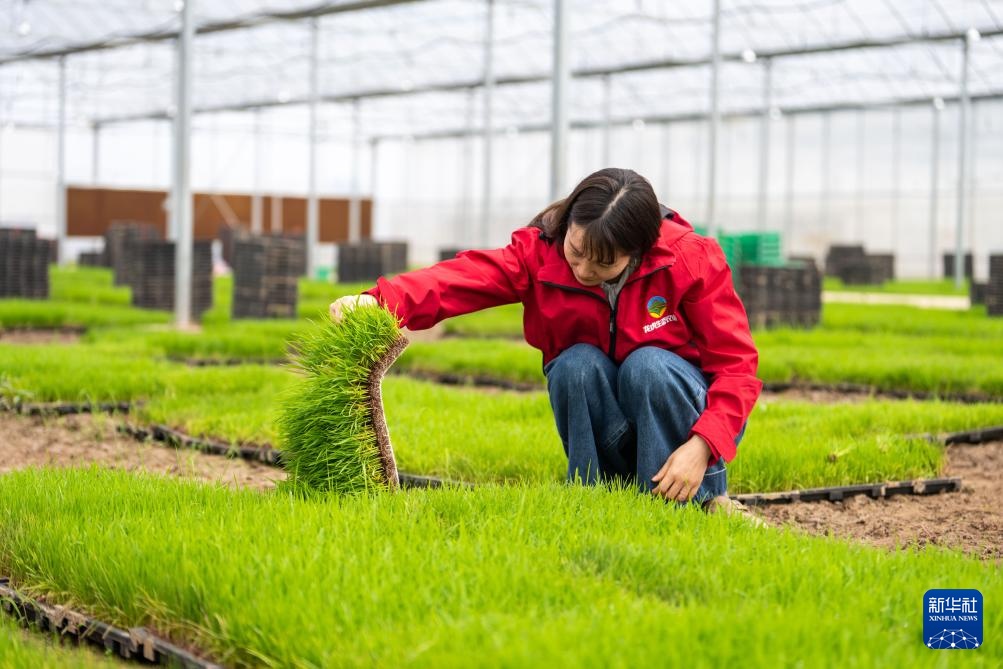4月17日,在高塘岭街道湘江村智慧农场育秧大棚,工作人员在观察秧苗长势。