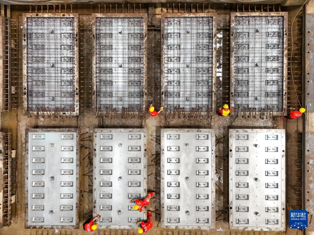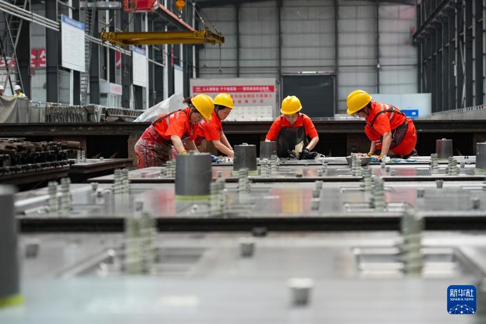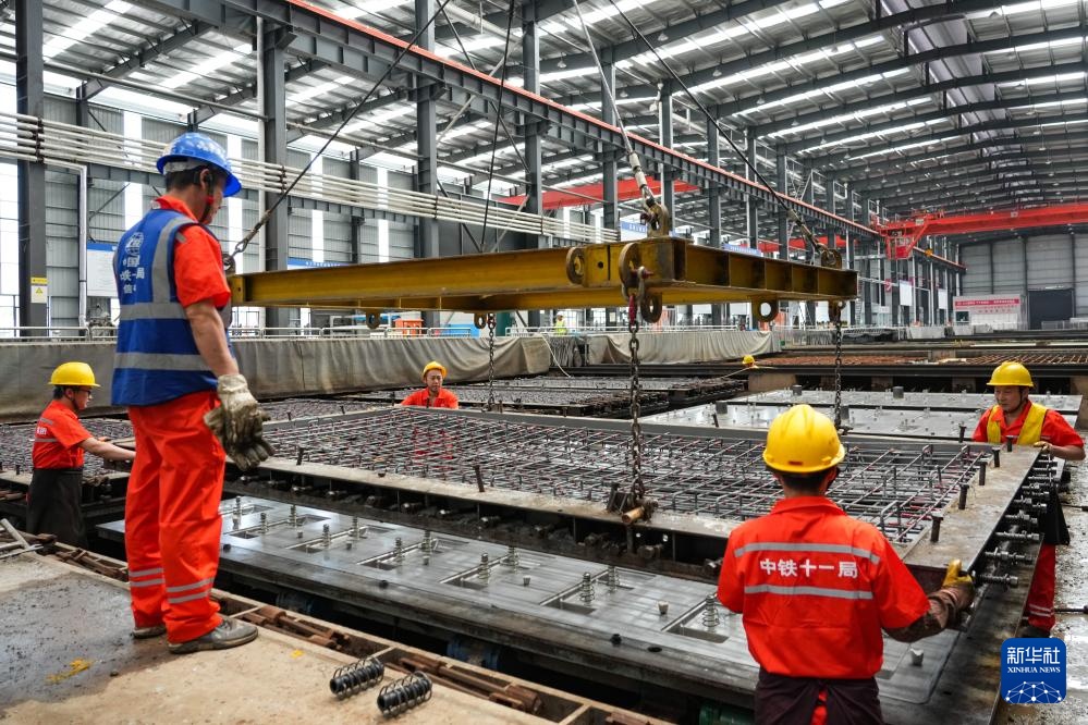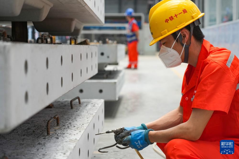 4月17日,在成渝中线高铁安岳制板厂,工人进行混凝土轨道板施工作业。