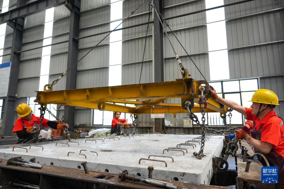 4月17日,在成渝中线高铁安岳制板厂,工人指挥龙门吊吊运轨道板准备发运。