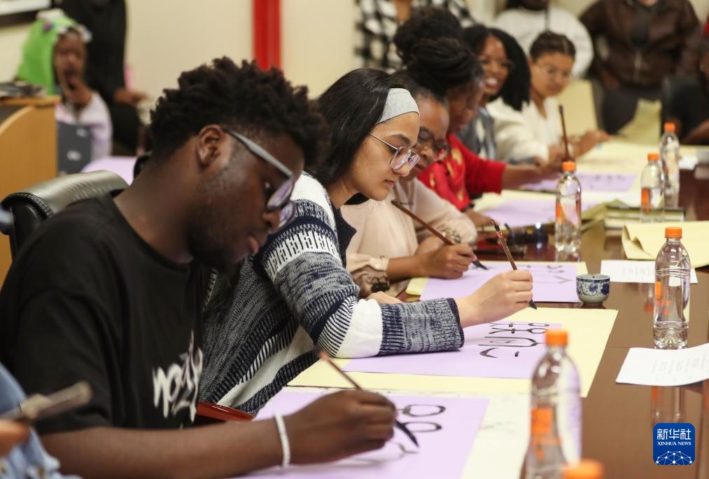 4月17日,在南非约翰内斯堡,学生们在约翰内斯堡大学孔子学院举办的文化交流活动上体验书写汉字。
