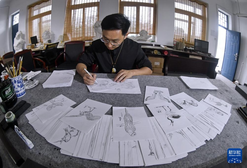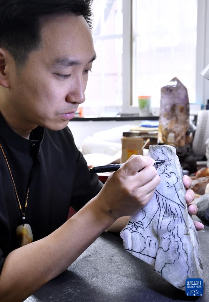 4月17日,张立群在工作室设计玉雕作品。