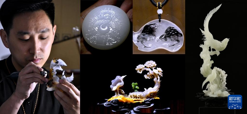 拼版照片:张立群和他的玉雕作品(4月17日摄)。