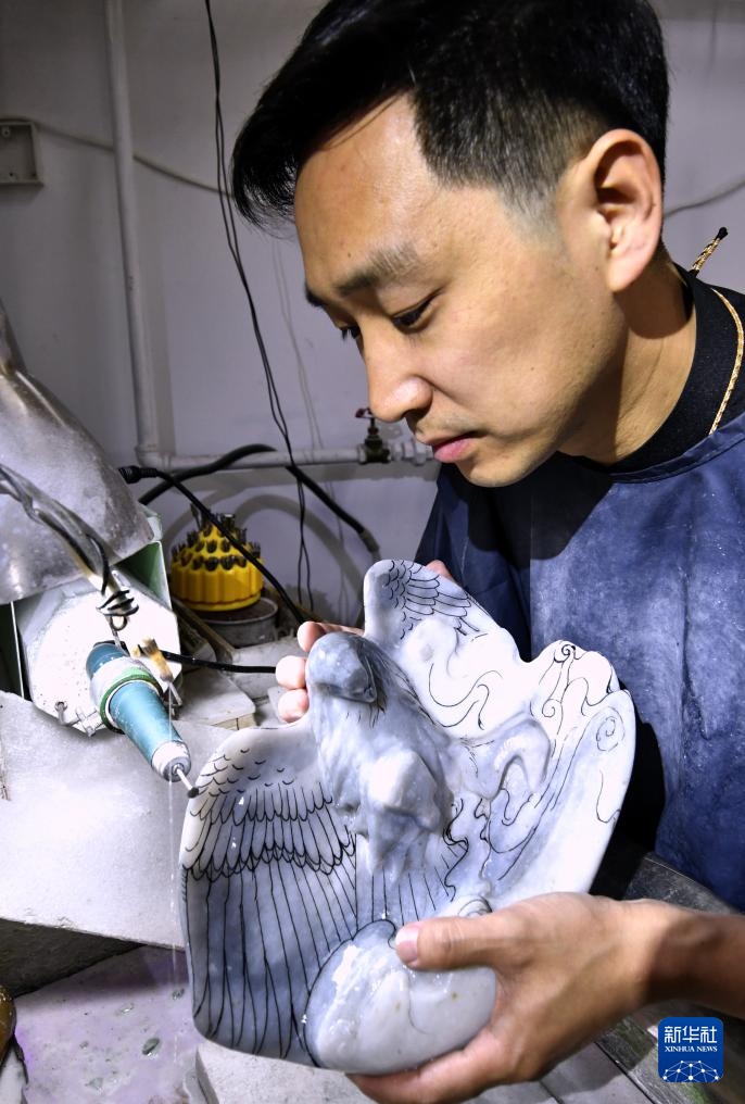 4月17日,张立群在工作室进行玉雕创作。