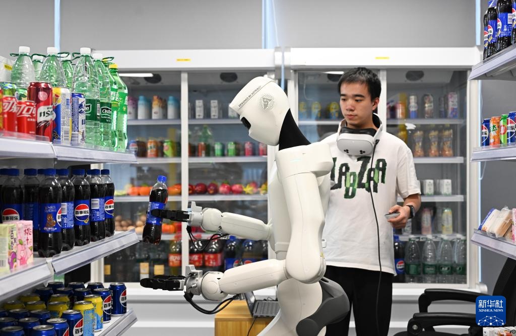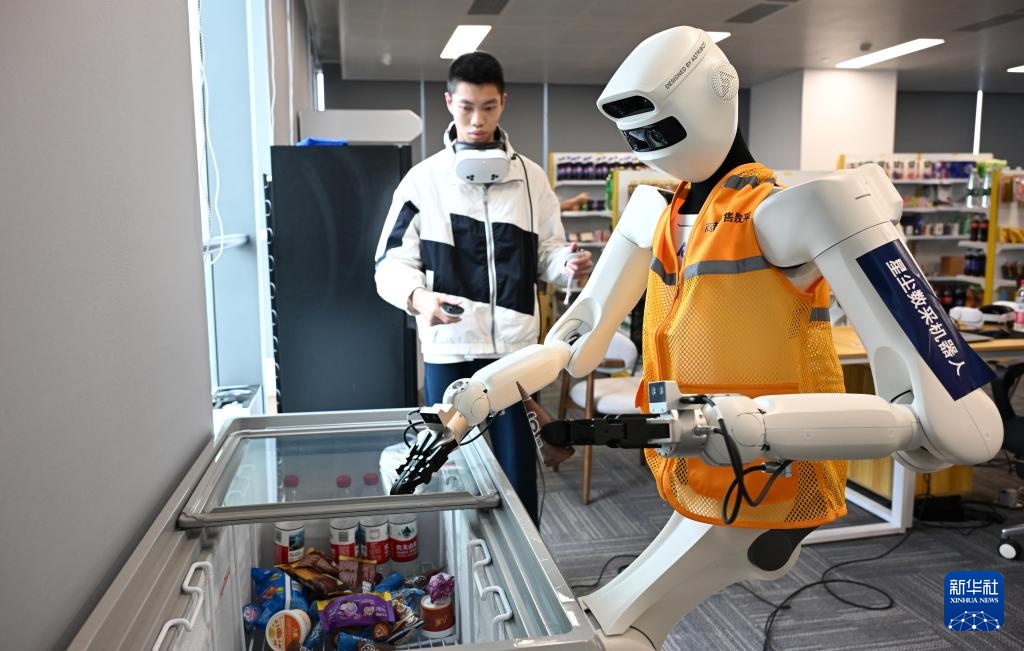 4月7日,在广州海珠区的广东省具身智能训练场,工作人员对机器人在超市模拟环境下分拣货物进行训练。