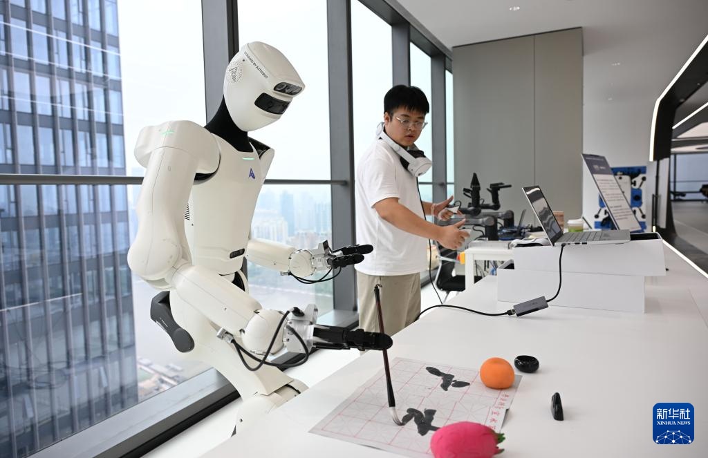 4月7日,在广州海珠区的广东省具身智能训练场,工作人员训练机器人写毛笔字。