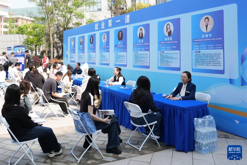 4月18日,求职者在湖南师范大学招聘会现场接受就业创业指导。