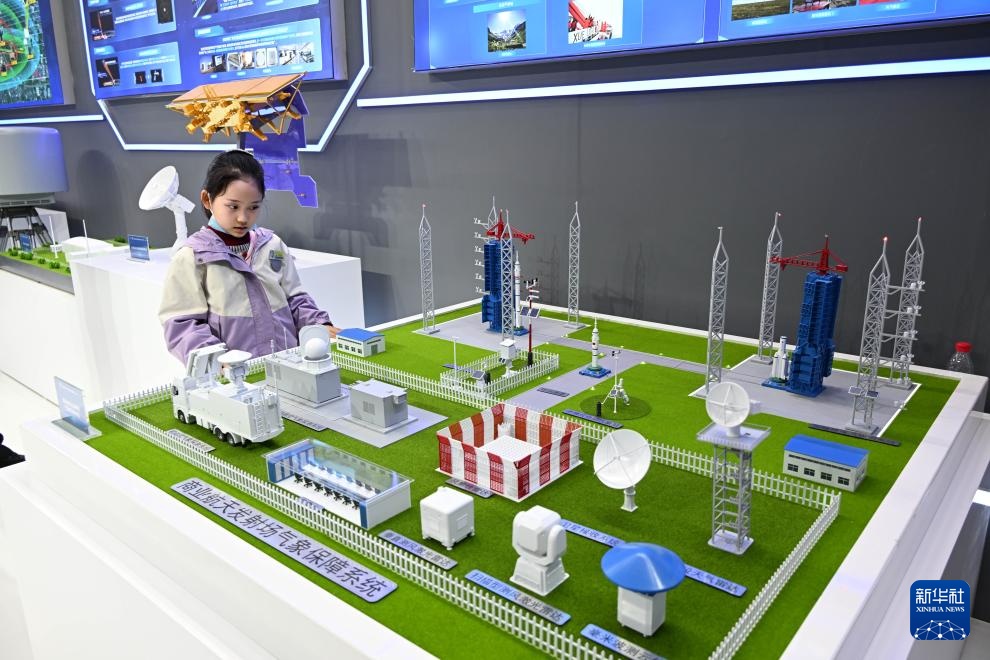4月18日,一名女孩在雷达未来大会展览区观看航天发射场气象保障系统模型。