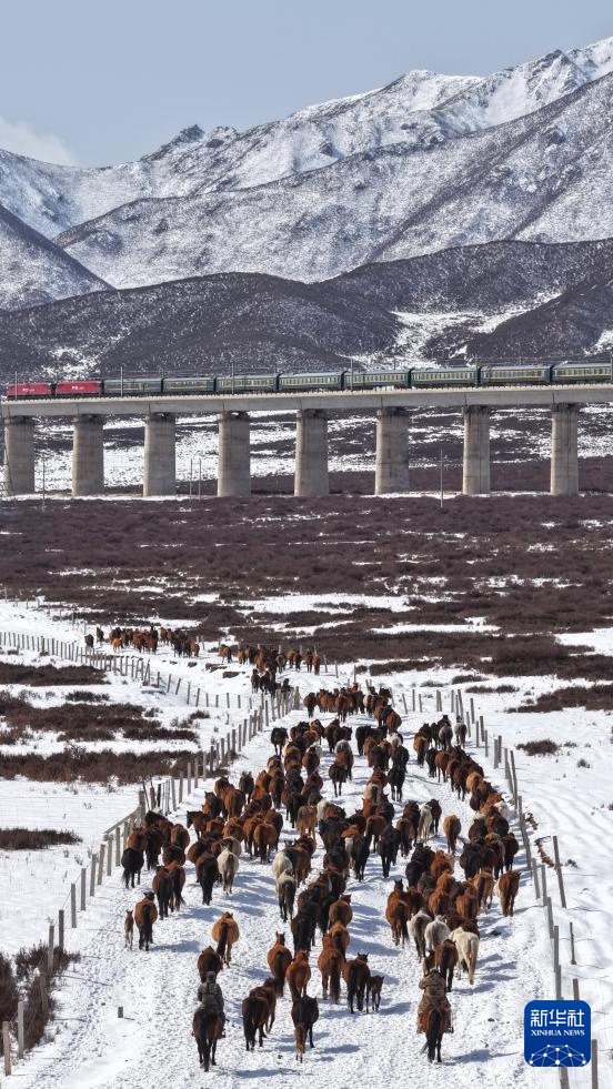 4月14日,甘肃山丹马场的牧马人组织马群转场,撤离农作物茬地,重返休养了一个冬季的天然草原(无人机照片)。