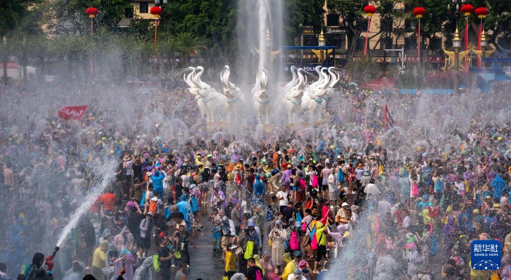 4月15日,人们在云南省西双版纳傣族自治州景洪市泼水广场参加泼水狂欢活动。