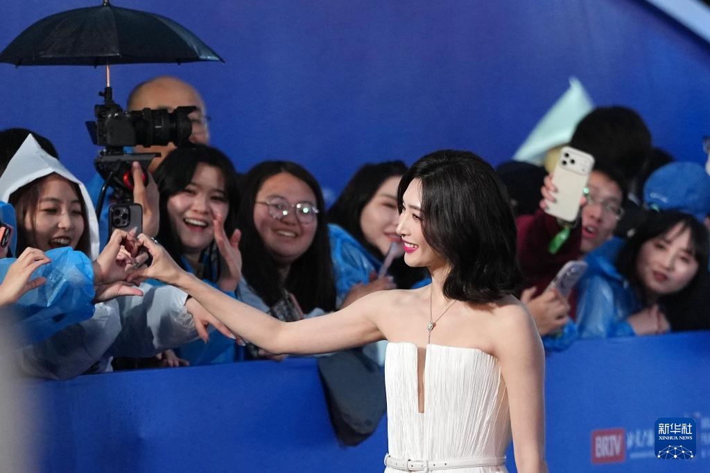 4月16日,第十六届北京国际电影节在北京雁栖湖国际会展中心开幕,演员江疏影在开幕红毯上与影迷互动。