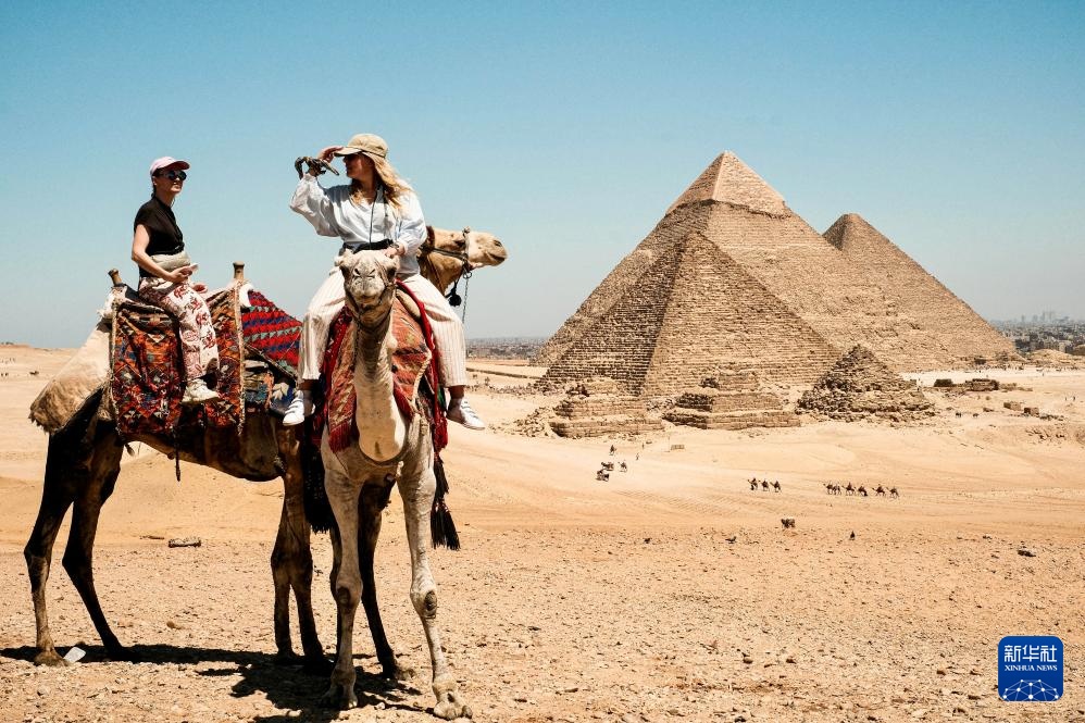4月9日,游客在埃及吉萨金字塔群景区骑骆驼。