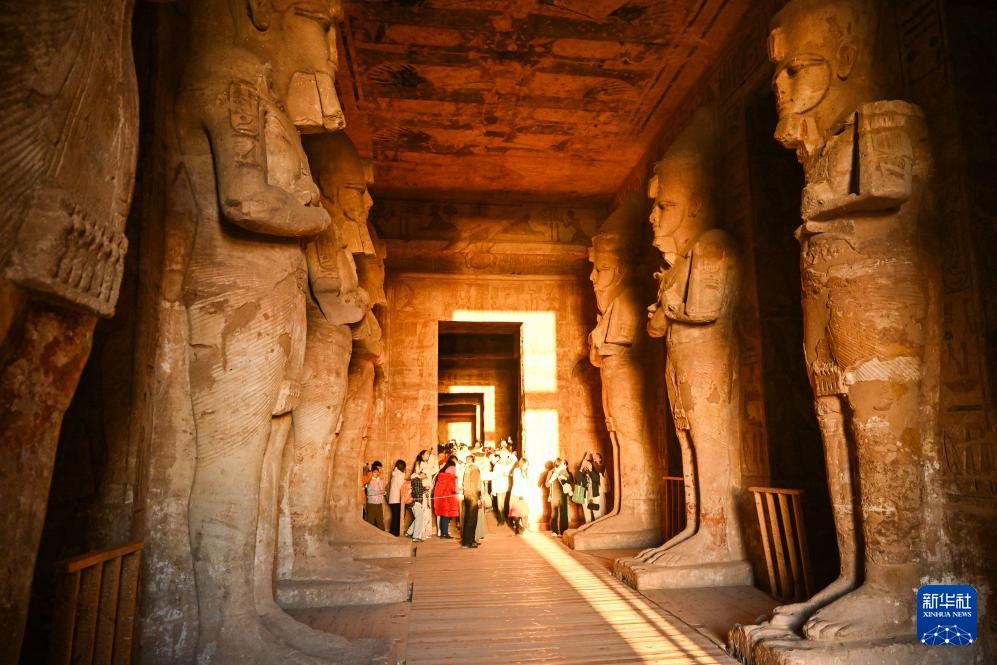2月22日,在埃及南部阿斯旺省的阿布·辛拜勒神庙,游客拍摄被阳光照亮的神庙内部。