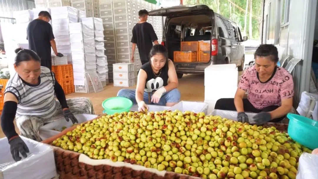 永仁县年平均日照时长2836小时,日照率达65%以上,年平均气温19.2℃,无霜期315天,平均昼夜温差15℃,正是得益于独特的气候条件和充足的阳光资源,永仁冬枣糖分积累更加充分,果肉更加脆甜多汁。在包装车间,工人们正熟练地将冬枣按规格分拣、包装,一箱箱的精品水果整装待发。