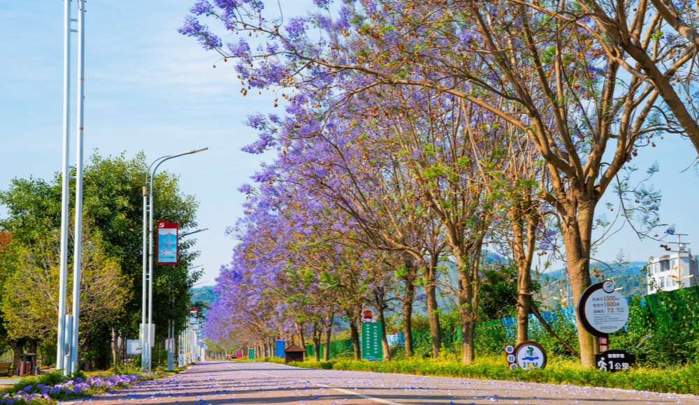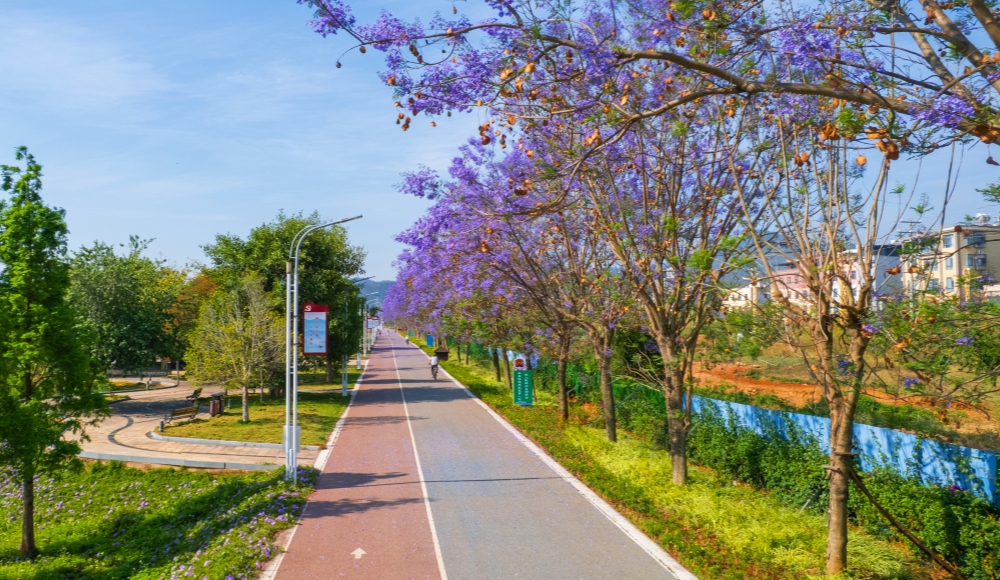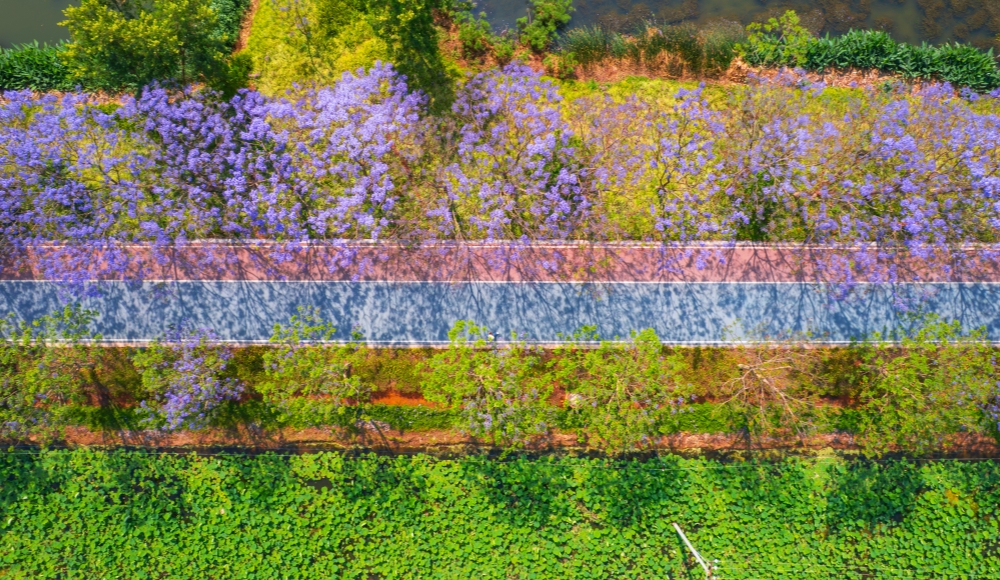 航拍蓝花楹步道(4月7日摄)。新华网发(石屏县融媒体中心供图)
